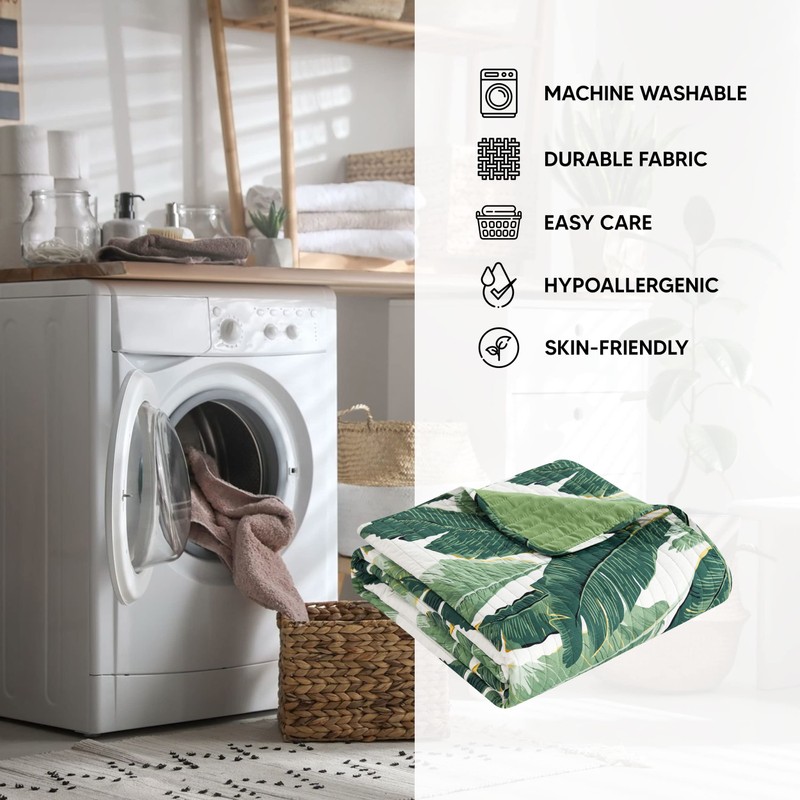 - FLORAL DESIGN - Lush green palm tree print on the face with a solid color backing - Design coordinated pillow shams included