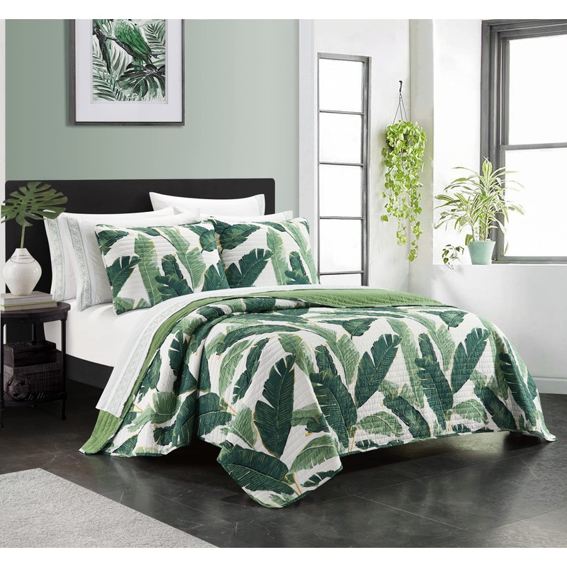 Chic Home Palm Springs 9 Piece Quilt Set Stitched Palm Tree Print Bed in A Bag - Sheet Set Decorative Pillow Shams Included, Queen, Green