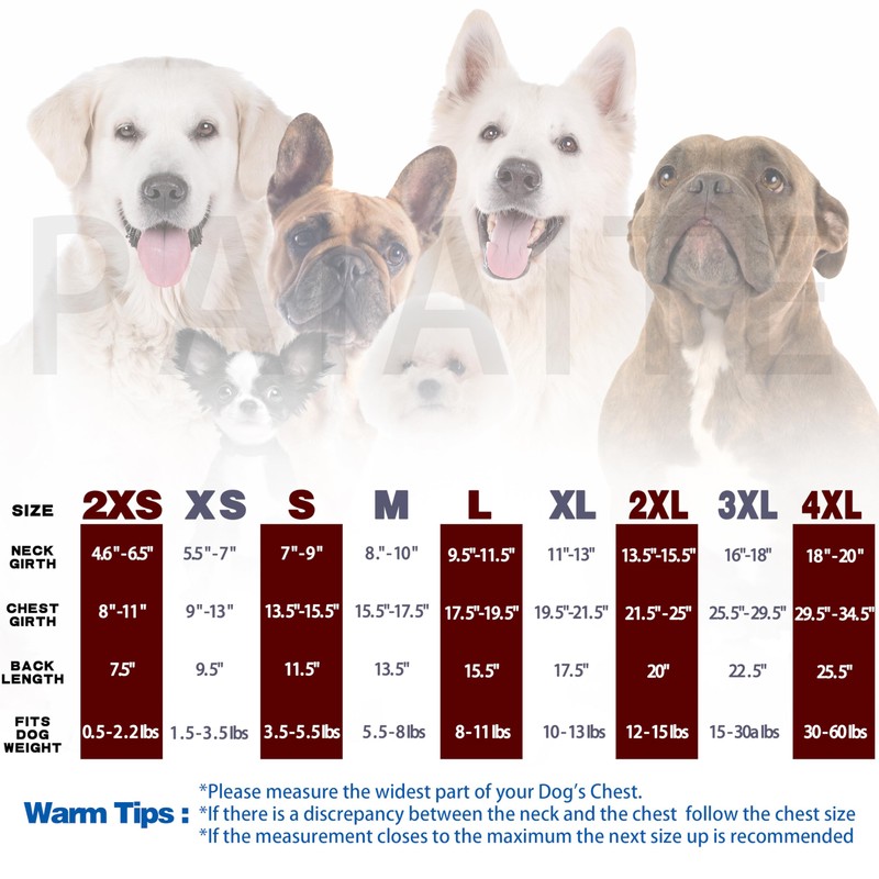 - Sizes: The shirt is available in different sizes to fit small to medium-sized dogs. Be sure to measure your dog's chest and neck girth before purchasing to ensure the best fit. The size chart can help guide you in choosing the right size for your pup.