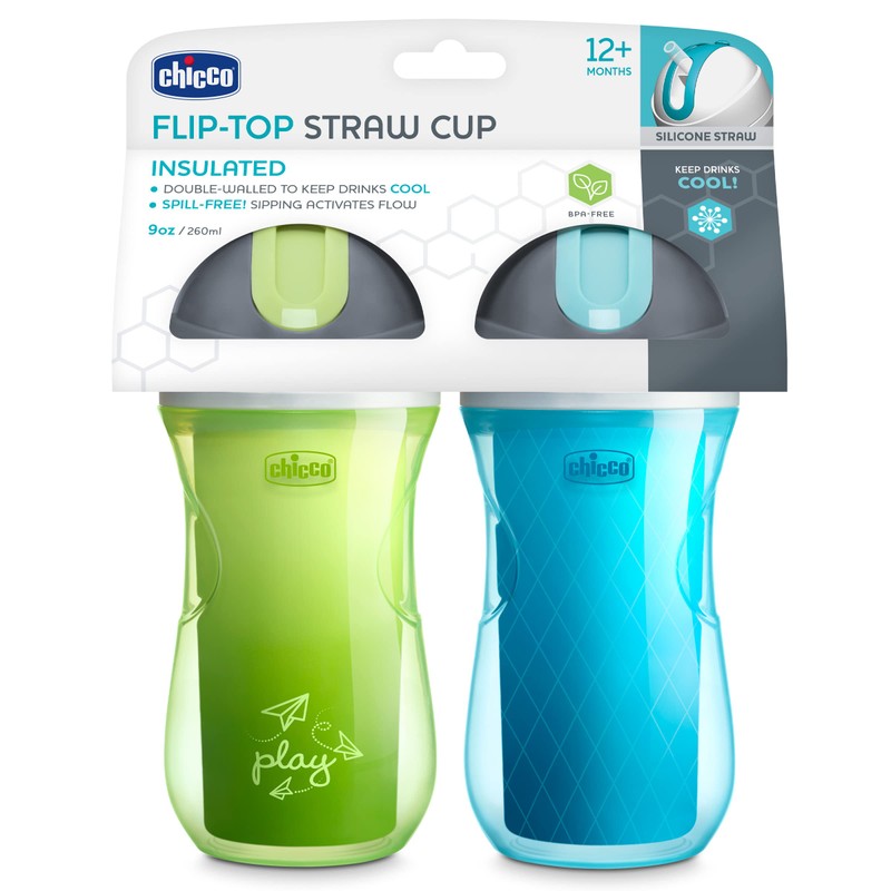 Keep it cool with the Chicco 9oz. Flip-Top Straw Cup. The double-wall design provides insulation essential for keeping cold drinks cool longer, and the soft silicone straw is easy to keep clean. Gentle sipping activates the flow of liquid from the straw, so you can flip the cup upside down and all around. You can cover the straw between drinks with the integrated flip-top closure. Just slide the cover over the straw to easily hide it away. The contoured shape of the cup is specially designed for tiny hands to grab and hold. Ergonomic indents guide hand placement, helping baby prepare for proper cup holding. The insulated Flip-Top Straw Cup is loved by kids and parents alike with stylish colors and mix-and-match tops and bottoms for the perfect cup. Like all Chicco cups, the Flip-Top Straw Sippy Cup fits easily in stroller, car and car seat cup holders for convenient access and easy storage. When you’re done with the cup for the day, quickly and easily wash all parts which are easy to remove and top-rack dishwasher safe. With minimal parts that are interchangeable, the Chicco Insulated Flip-Top Straw Cup is exactly what every parent needs: functional, minimalistic, easy-to-clean and loved by big and little kids alike. Suitable for children aged 12+ months.