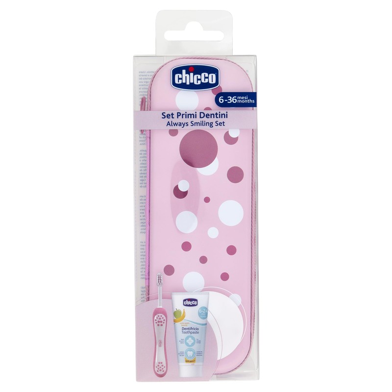 - El estuche contiene una pasta de dientes con sabor a manzana y plátano (6-24 meses) y un cepillo de dientes (6-36 meses) con cerdas suaves.