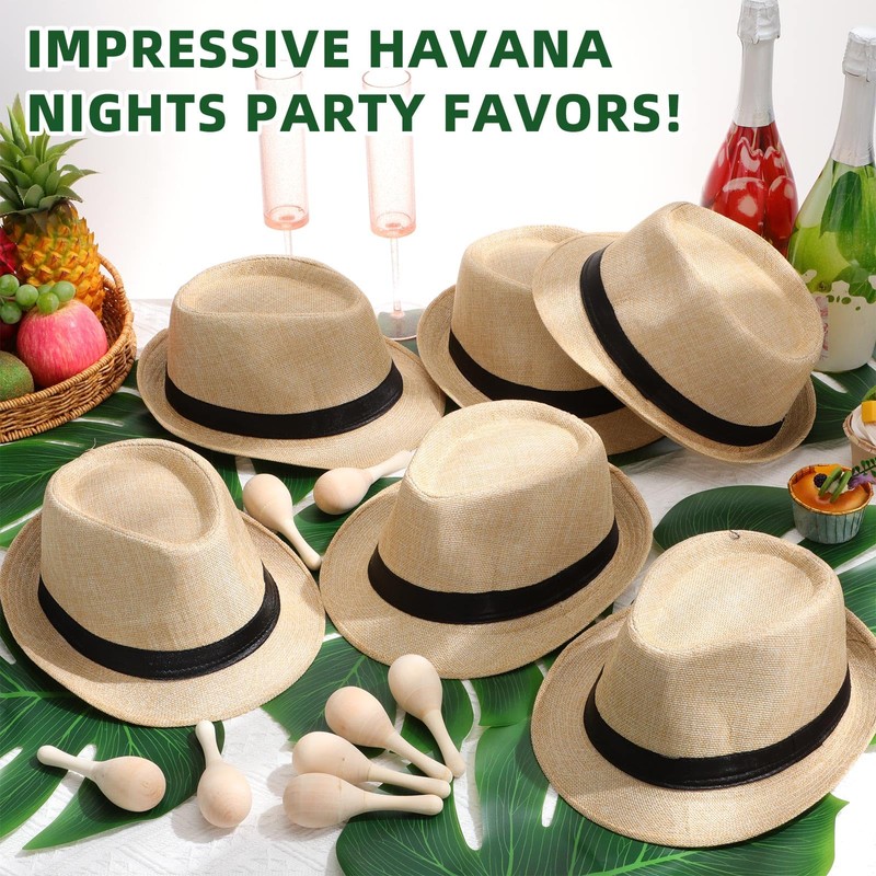 Chicingyou 36 Pcs Havana Night Party Centerpieces 12 Straw Hats 12 Palm Leaves and 12 Wooden Maracas Party Decoration for Havana Night Cuban Birthday Wedding Celebration Accessories