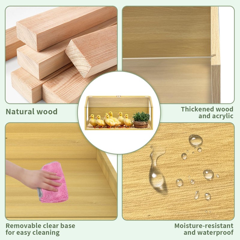 - Durable and Easy to Clean: Crafted from natural wood with smooth surfaces and a removable base, this brooder box withstands daily use. Cleaning is quick and hassle-free—simply wipe or lift the base