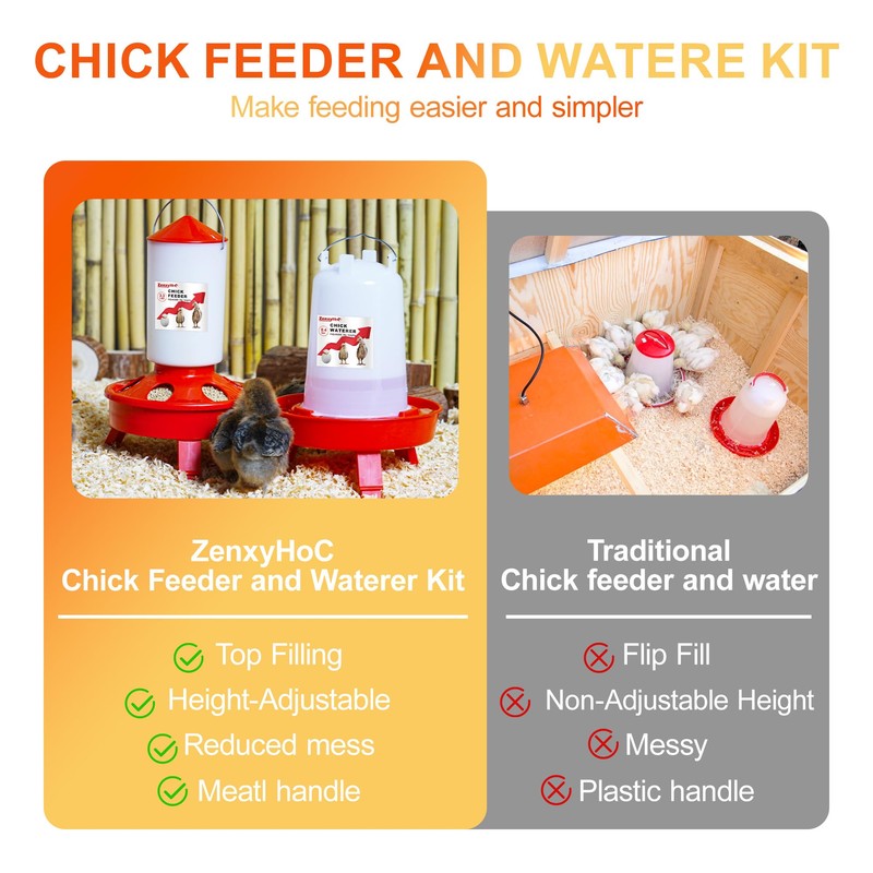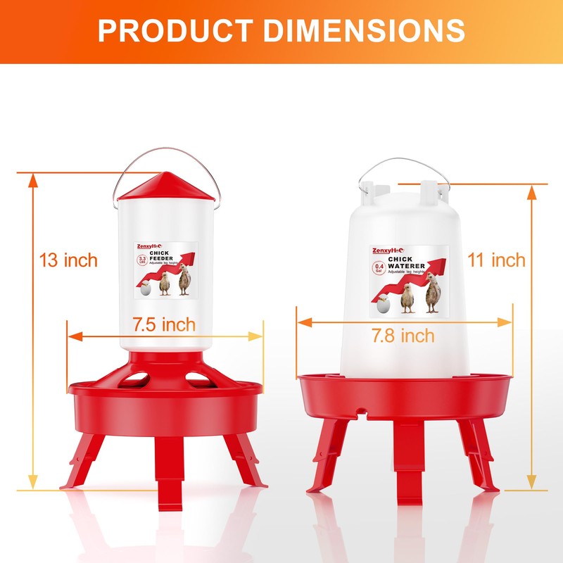 ZenxyHoC Chick Feeder and Waterer Set, Top Fill 0.4 Gal Feeder and 0.4 Gal Waterer with Scoop and 3 Adjustable Heights Legs Red