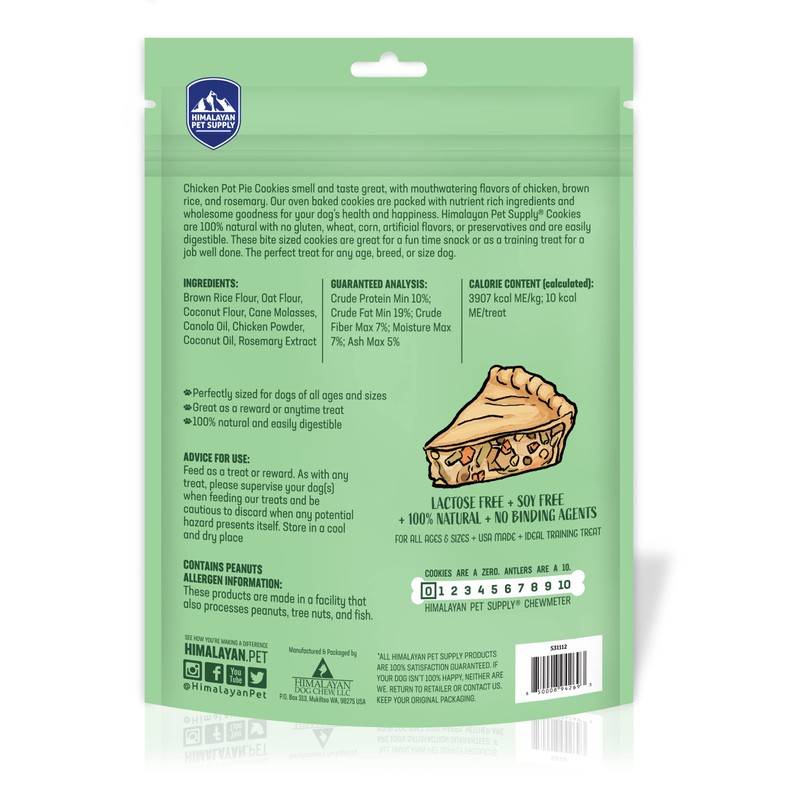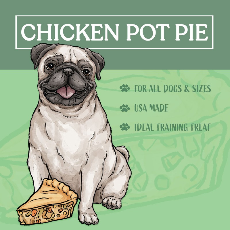 - FOOD FOR ALL - Chicken Pot Pie Cookies are an excellent treat for dogs of all ages and sizes. 14 OZ in resealable pouch. Proudly Baked in the USA