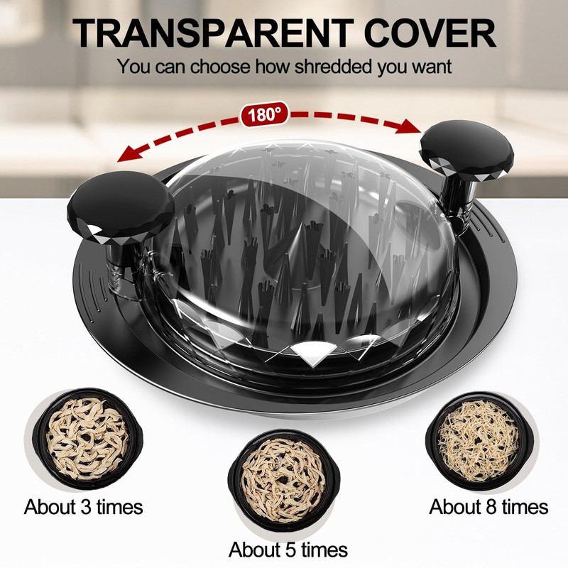 - đăEASILY SHRED MEATă This chicken shredder is a multifunctional kitchen gadgets for food chopper, which can shorten dinner preparation time. Due to the middle upgraded rotate construction and visible clear cover of the meat shredder tool, you could shred the meats in seconds. Itâs faster and more efficient than metal meat shredder claws, when you need to shred an entire family sized portion of meat and food