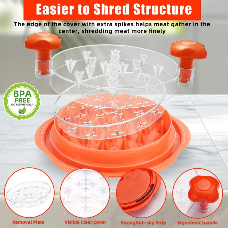 - Effortlessly Shred Meat: Shorten dinner preparation with Akagani chicken shredder tool! The tool builts-in plastic spikes that cover the whole area which can tightly clamp the food, the lid has extra spikes on the edge, which help gather the meat in the middle, cutting it evenly. allowing you to efficiently shred in a matter of minutes into perfectly positioned shreds every time. Quickly and evenly shred chicken, beef, pork, and vegetables.