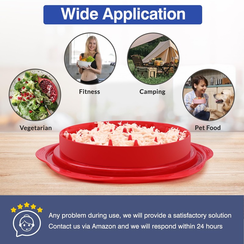 • 【Easy to Use】: ① Place the cooked meat into the chicken shredder; ② Cover with the lid and twist back and forth several times; ③ Open the lid to enjoy the shredded meat. Tip: You can see the meat state via the transparent lid, enabling you to adjust the times you twist to get your preferred meet shape