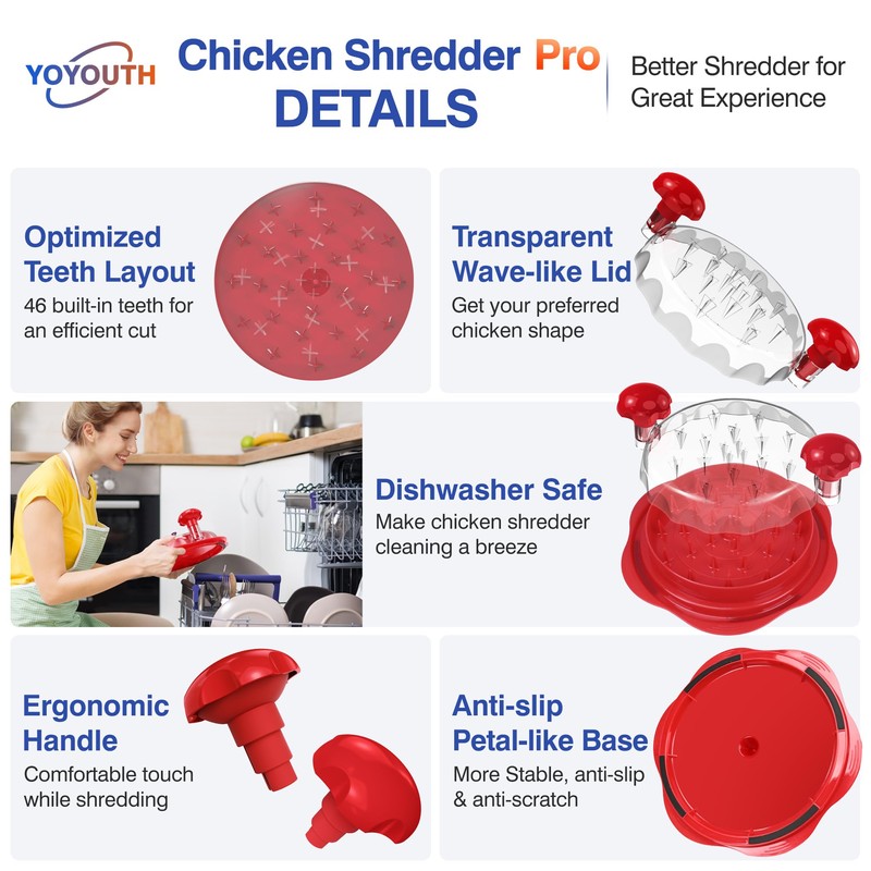 • 【33% Up in Shredding Efficiency】: With optimized layout, our chicken shredder's built-in teeth cover the entire area, and the extra spikes on the edges of the lid help gather shredded food in the middle for an even & efficient cut