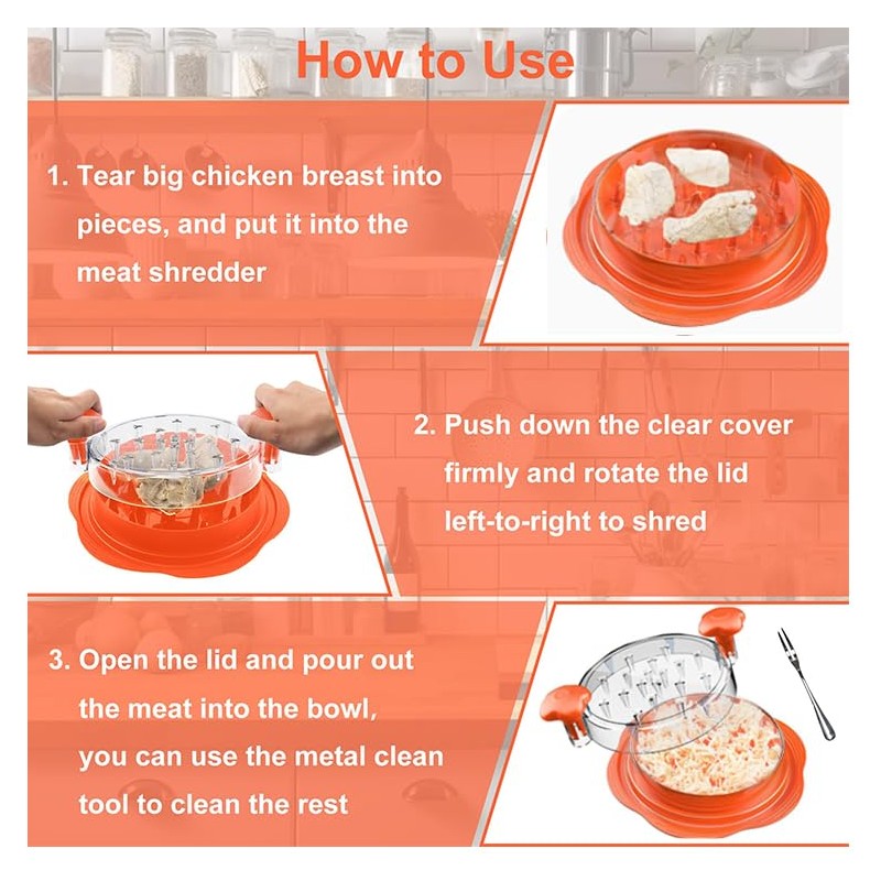 - 【Easy To Use】: Cut the cooked complete chicken breast into three pieces, select one piece and place it on the spike, close the lid. Press to penetrate the flesh and rotate the lid to quickly shred within a few seconds. The hand chicken shredder is also suitable for pork, beef, vegetables, etc.(forbid using raw meat to shred it, as it will damage the spike.)