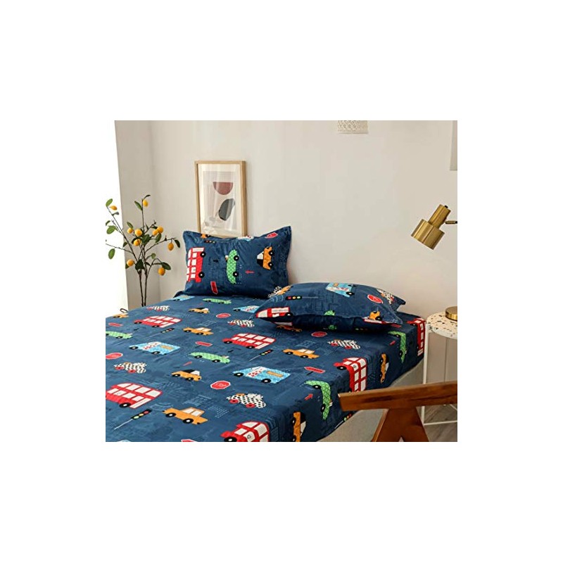 Chickwin 100% Polyester Fitted Sheet, Child Cartoon Print Fitted Sheet, Box Spring Bed, Soft Fitted Sheet, Mattress Protector for Bed Sheet, Heights up to 30 cm (Blue Car, 2 Pillowcases)