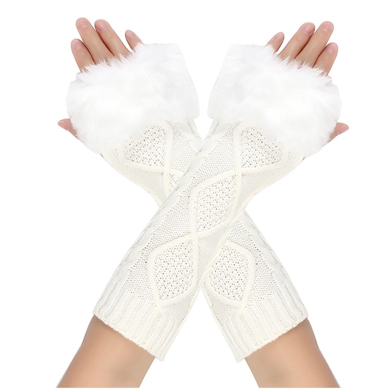 Chiclinco Crochet Leg Warmer Fleece Lined and Fur Arm Warmer Fingerless Gloves Set for Cold Weather Boot Socks Ice Skating (2, White)
