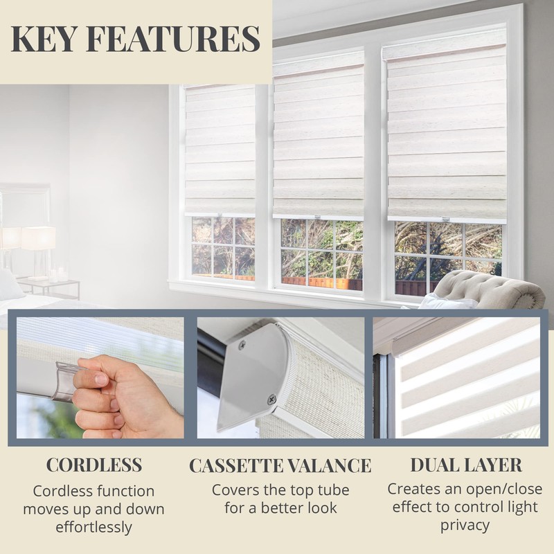 **Cordless Zebra Shades **** Everyday Zebra Shades with a cordless feature, matching valance and durable design Chicology, the solution for Simple Affordable Blinds An easier way to buy blinds online Project Success At Chicology, we provide a 12-month along with our committed customer support Do not compromise between style and affordability We believe that style does not have to come at a heavy price. Our Zebra Shades have a sleek and stylish look with modern functions for the smoothest operation. Our range of fabrics gives you the freedom to choose a unique and budget friendly product to create a relaxed vacation home vibe. Perfect For LIVING ROOM: Add texture to your interior with our combi blinds! Designed as light filtering window coverings, these shades gently filter light to create an elegant and welcoming environment. BEDROOM: Sleep like you’re on vacation by adding a sleek look to your bedroom. Upgrading your room’s style with zebra roller shades is both eye-catching and rejuvenating. DINING ROOM: Enjoy a meal with great company without the glaring sun rays. Chicology’s UV blocking window blinds allow you to alternate between sheer or opaque without compromising the kitchen light. OFFICE: Create a sophisticated environment for your home office. Increase productivity as our durable shades compliment the lighting in your office without disturbing your work flow. Measurement Guide for the Perfect Fit At Chicology, we know how important it is to have the correct measurements. With this in mind, we aim to provide simple measurement instructions for all. Can be used for INSIDE MOUNT or OUTSIDE MOUNT. This product is has a ½” deduction with the fabric width being shorter by 1 ½” to avoid fraying. A minimum depth of 1-inch is required for inside mount or 2-inches for a flush inside mount. We are Here to Help Call us directly at 866-999-6188 or email us at support@chicology, our hours are from 8am-5pm PST. Free color samples available. Request free sample swatches today. Contractors, designers, builder welcome-call us for bulk pricing **
