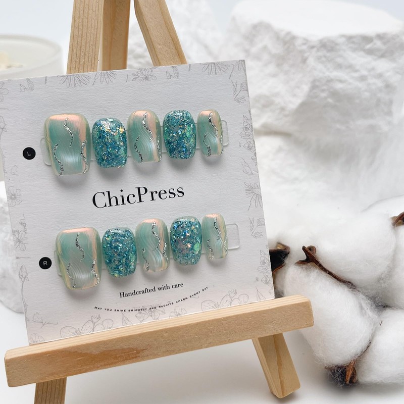 ChicPress Handmade Press on Nails Short Glitter Coffin Glossy Chrome Finish - Reusable and Secure 10pcs (Dreamy Fairy,S)