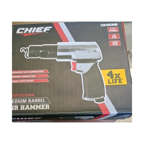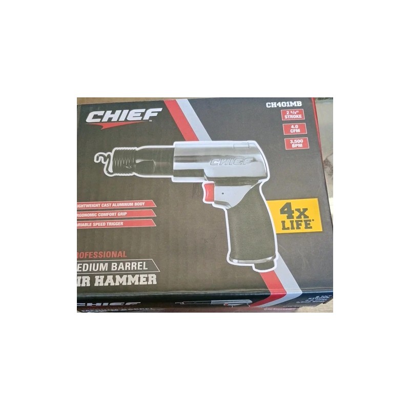The Chief Ch401mb Air Hammer is designed with a medium barrel for efficient performance. This air hammer is a powerful tool commonly used in automotive and metalworking industries for tasks such as metal cutting, chiseling, and shaping. The Chief brand is known for producing reliable and high-quality tools, making this air hammer a trusted choice for professionals in need of a durable and effective tool for their workshop or garage.