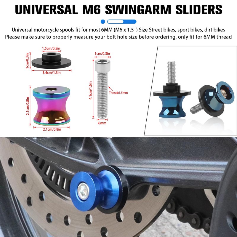 - FITMENT - motorcycle swing arm spools fit for most 6MM (M6 x 1.5mm ) size street bikes, sport bikes, dirt bikes. Please make sure to properly measure your bolt hole size before ordering, only fit for 6MM thread