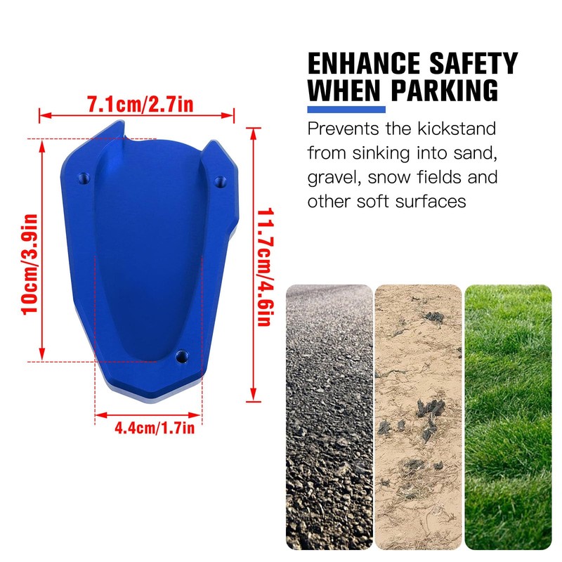 - ENHANCE SAFETY WHEN PARKING - Kickstand extender prevents the kickstand from sinking into sand, gravel, snow fields and other soft surfaces; avoid motorcycle side stand scuff; reduces scuffing on garage floors