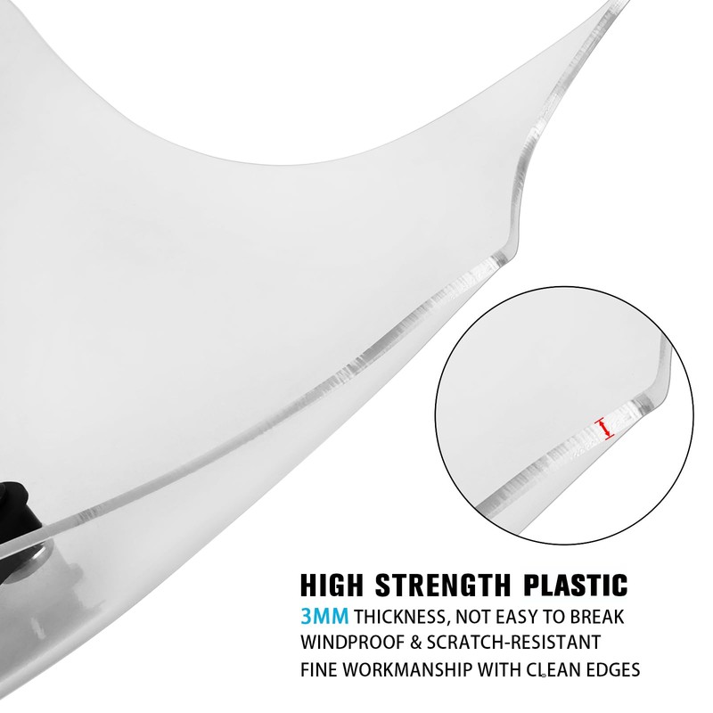 - HIGH QUALITY - High strength 2mm thickness aluminum clamps material+ 3mm thickness polycarbonate plastic windscreen, which is sturdy /scratch-resistant /weather and impact resistance ,not easy to break and long-lasting