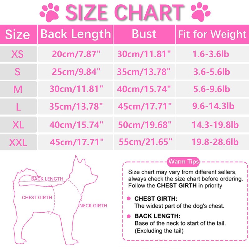 X-SMALL: neck girth(7.87"/20cm), chest girth(12.20"/31cm), back length(7.87"/20cm), suggested weight(1.5-3.3lb)