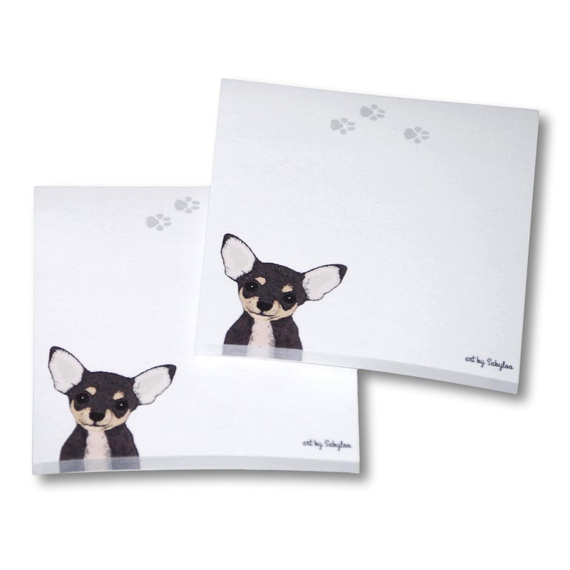 Our Chihuahua sticky notes are a DogLoverStore exclusive. Created in collaboration with Sabyloo, these sticky notes are cute and convenient. Therefore, you can use them in your home, office, or anywhere you need to jot down a quick note. The dog breed artwork is by Sabyloo, a New York based artist who loves all things dogs. The notepads are authentic brand and come in a set of two. Each pad has 50 sheets, totaling to 100 sheets. Also, each design features the black Chihuahua with 3 dog paws extending across the top. In addition, the designs are printed on white paper with rich pigmented ink. Above all, each sticky note is fully designed and printed in the USA. Measures 3 inches by 3 inches.