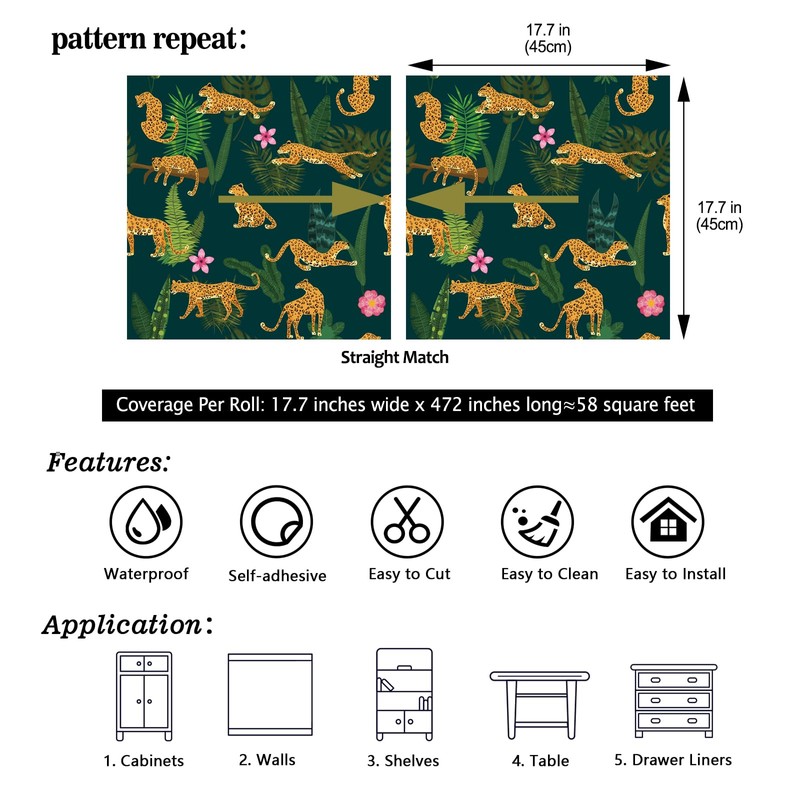 - 【Easy to Install】With its self-adhesive backing and gridlines for precise cutting and measurement, this Leopard wallpaper is a breeze to install even for beginners. Easy to apply, just peel and stick to any smooth surface. Renter-friendly decor, temporary wallpaper for apartments
