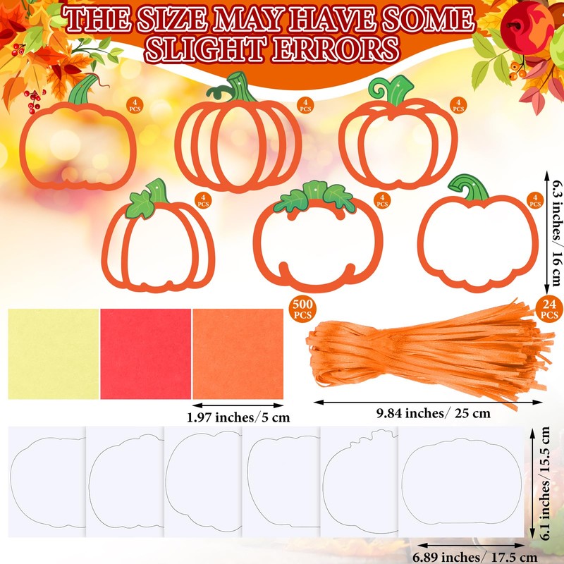 • Rich Styles and Quantity: imagine the diverse project opportunities provided by the fall crafts, which includes 24 sets of crafts (6 styles in total) including 24 pumpkin cutouts with hollowed out middle, 24 transparent stickers, 24 ribbons of about 25 cm, and 500 colored tissue paper (3 colors in total); Whether crafting alone or throwing an artists' party, this tissue paper kit empowers you to create personal projects for variety activities