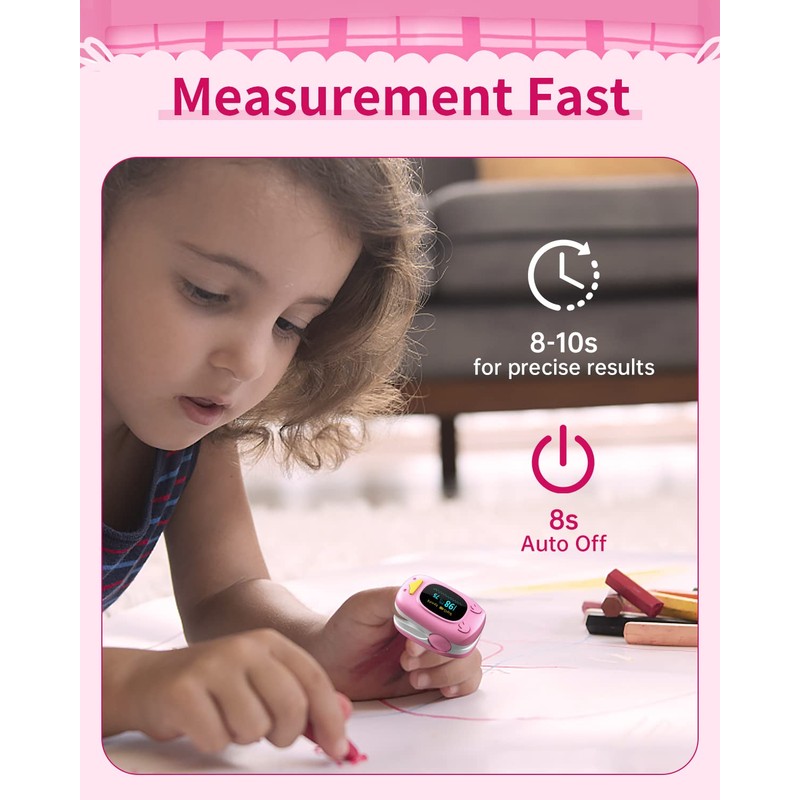 - [Developed for Children] This finger pulse oximeter fits for kids 2.5-15 years old, and is not designed for newborns and infants. (NOTE: When you measure, Your finger and body do not tremble during measuring. Pls keep still, avoid measurement failure )
