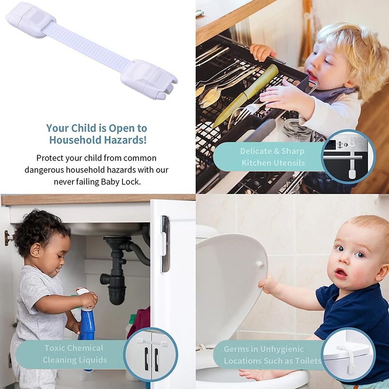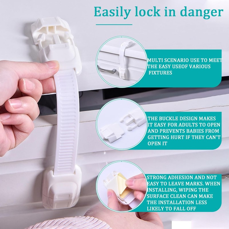 - ✅ MULTIPLE USES: The flexible and adjustable-length straps can be used on flat surfaces as well as around corners. Perfect for cabinets, refrigerators, ovens, toilets, windows, and more.