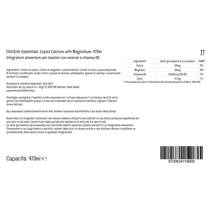 - IMPORTANT NUTRIENTS: Liquid Calcium with Magnesium by ChildLife Essentials contains 84mg of calcium, 38mg of magnesium, 0.7mg of zinc and 0.825mcg (33 IU) of vitamin D3 per teaspoon (5ml), important nutrients involved in many processes in the human body