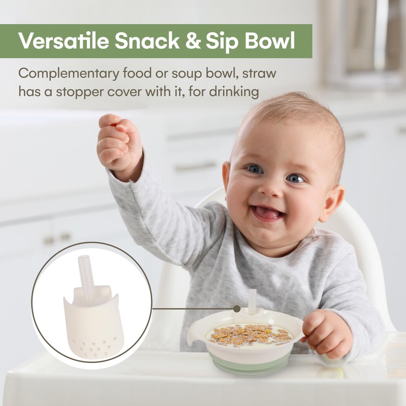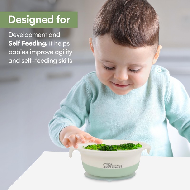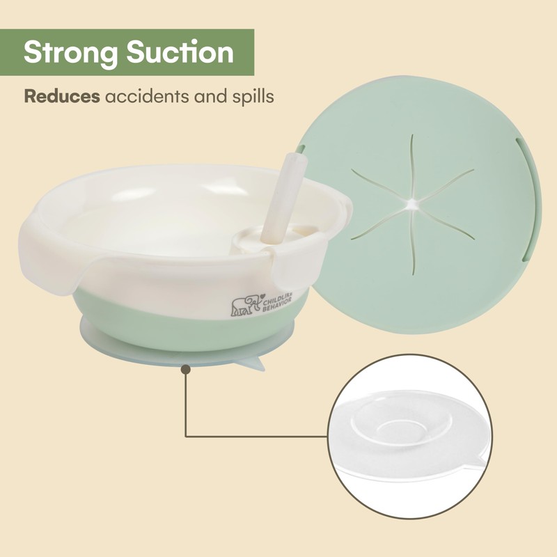 CHILDLIKE BEHAVIOR 3-in-1 Baby Sippy Bowl Set - Mess-Free Mealtime Magic - Includes Cereal Bowl, Lid, Ergonomic Spoon - Snack Bowl for Soup, Milk, Cereals - Silicone for Little Hands - Green