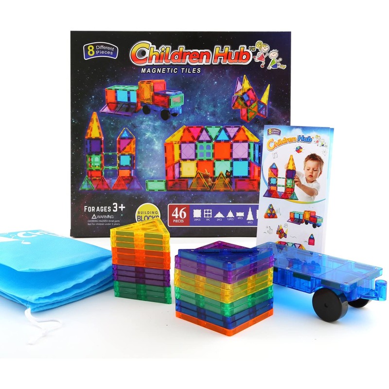 Children Hub 46pcs Magnetic Tiles Set - Educational 3D Magnet Building Blocks - Building Construction Toys for Kids - Upgraded Version with Strong Magnets - Creativity, Imagination, Inspiration