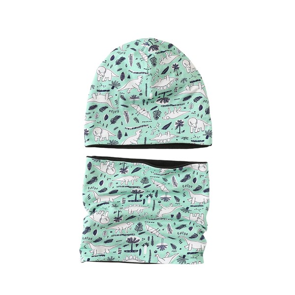 Children's Beanie Hat Scarf Tube Scarf Set, 360° Reflector Children's Hat & Loop Scarf Set, Cotton Loop Scarf Thick Money Boys and Girls Autumn Spring Winter (Green - Dinosaur), Green