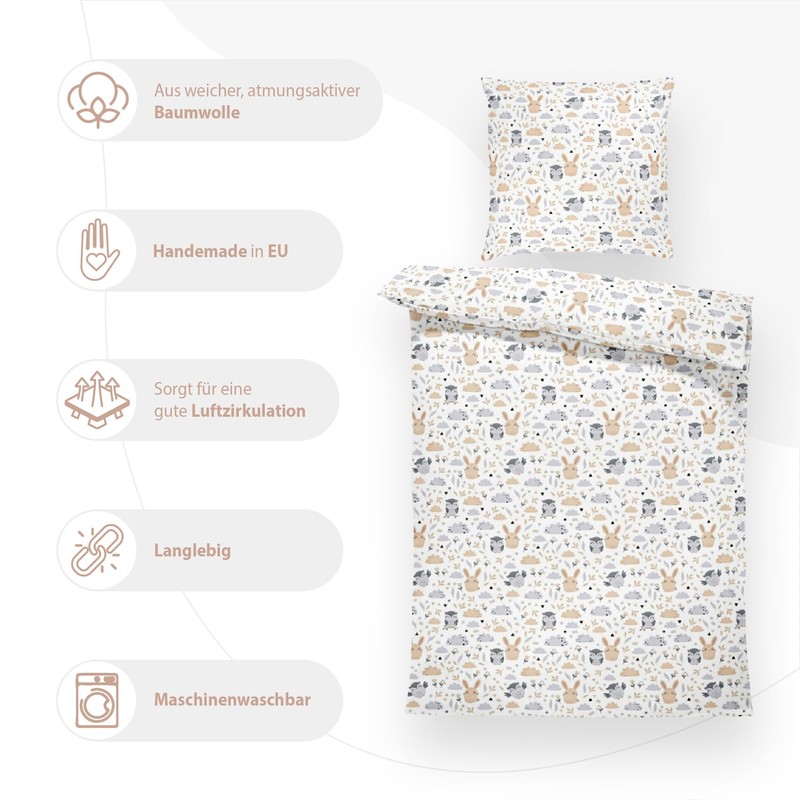 • Relaxing sleep: the children’s cotton bedding offers good temperature-regulating properties. The breathable cover regulates heat so that baby's skin stays dry and warm when sweating.