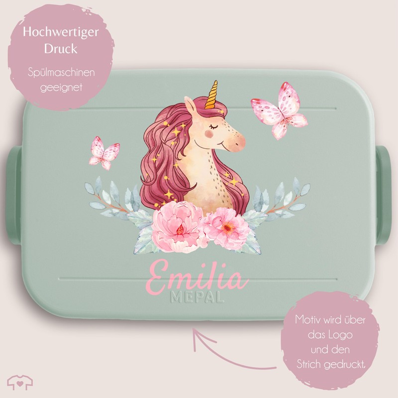 Children's Bento Box Midi Lunch Box for Mepal Bento Box - Unicorn First Name Last Name - 900 ml - Sage Green - Personalised Lunch Box Girls Personalised Lunch Box Name and