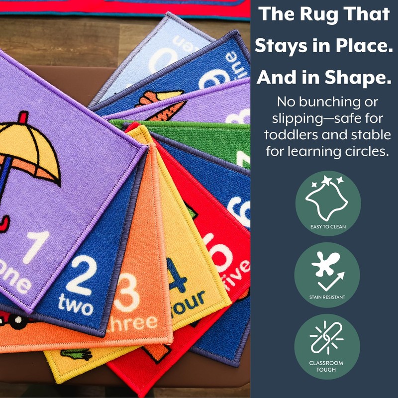 - ENGAGING CLASSROOM CARPET SET: Transform circle time with this vibrant set of 10 classroom rugs, each featuring a bold number to promote early math skills. Ideal for preschool rugs for classroom learning, these squares offer flexible, educational seating that makes counting fun. Set the Standard for Safe, Smart Classroom Floors.