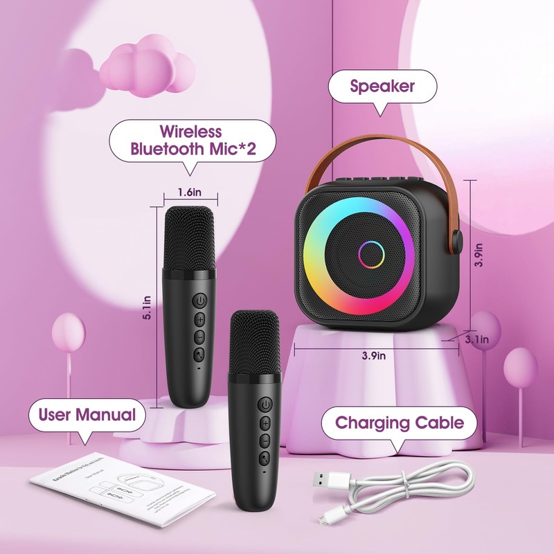 - Experience Hi-Fi sound quality -- The portable karaoke machine and 2 wireless microphones are equipped with a powerful audio driver. The karaoke speaker has strong anti-interference and noise reduction, which can be ideal gifts and toys for girls and boys to develop their singing or speaking talents.