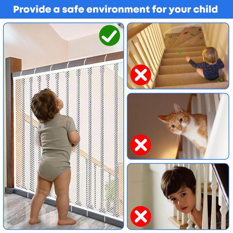 High-quality protective net: Our safety net is made of high-quality, tear-resistant fabric and can be attached to stairs, balcony railings, windows or patios and provides a reliable safety solution to protect your children and your pets from falls. Effectively prevent toys from falling off.