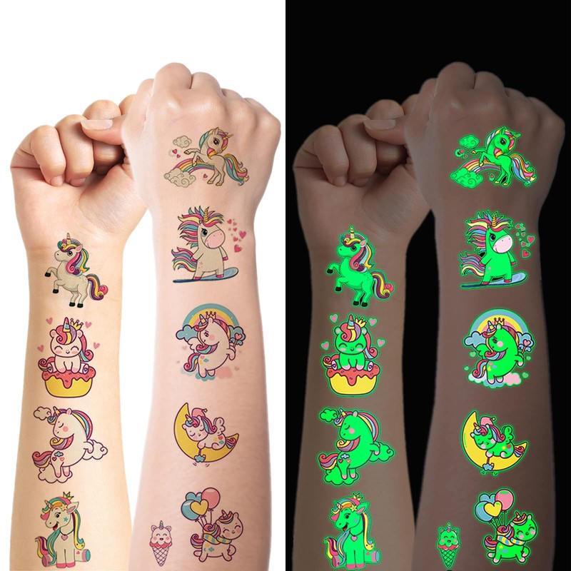 - Luminous children's tattoo: the unicorn children's tattoo has a fluorescent effect, which means that the unicorn tattoo can glow in dark areas. The unique luminous tattoo will awaken children's interest. Before applying fake tattoos, place the tattoo under the light for 1 to 2 minutes to make the tattoo brighter in the dark and the shine lasts longer.