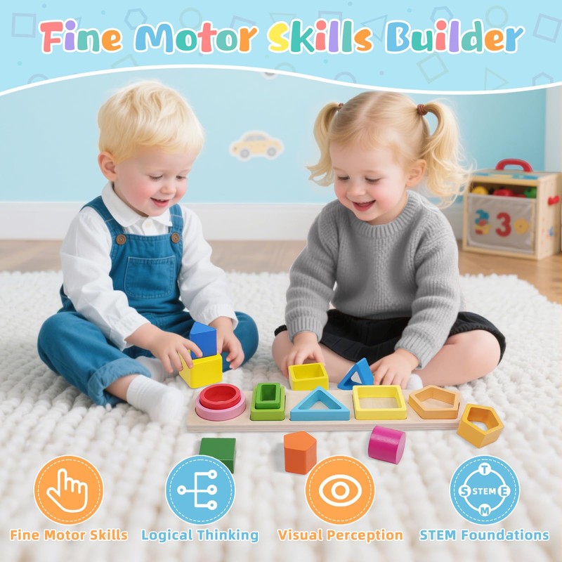 - Fine motor skills: different shaped building blocks in the right place promote children's urge to discover and promote hand-eye coordination as well as fine motor skills. This toy is elegant, small and easy to carry. You can take it anytime and anywhere and let your child play in peace. This interesting, colourful wooden toy helps your baby focus better and distinguish different colours and geometric shapes when playing.