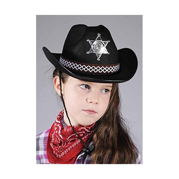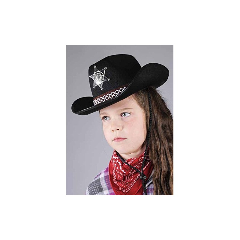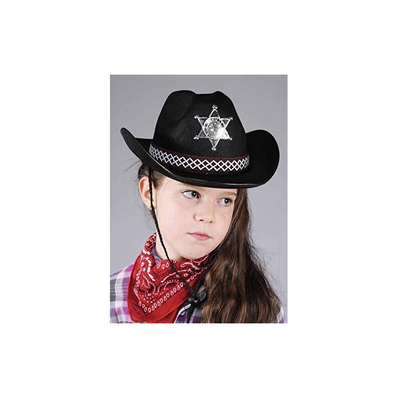 Child size suitable for boys and girls wild west cowboy fancy dress accessory black felt cowboy hat with a sheriff badge detail.