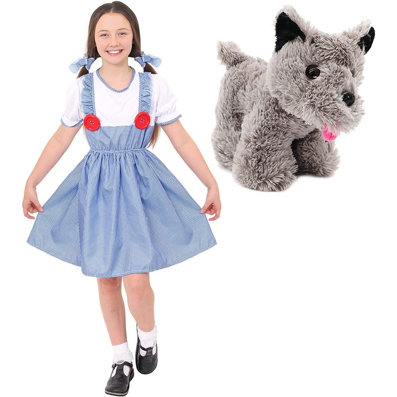 - COSTUME INCLUDES: Our Kansas Girl Costume includes a Blue and White Gingham Pinafore Dress with Faux White T-Shirt Design, with a Large Red Plastic Buttons Detailing on the straps, Plush Terrier Dog and Matching Gingham Hair Ties!