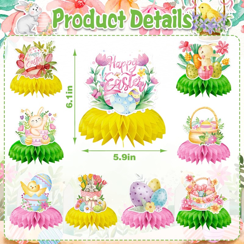 - 🐣[High Quality] - The easter day honeycomb centerpieces decors are made from sturdy durable cardstock, and adopt quality digital printing technology. Colorful and cute easter themed designs will be an indispensable party addition for boys girls easter holiday or birthday celebrations.