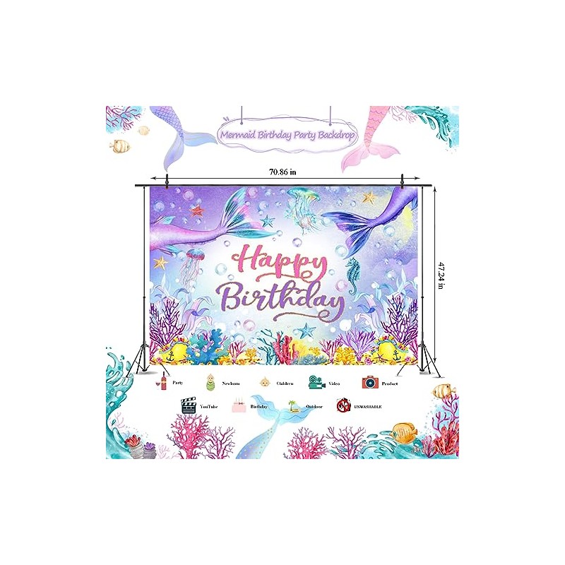 - 🐚[Mermaid Party Backdrop] - Large size happy birthday backdrop banner, designed with mermaid theme elements. Let's dive into a fantastic purple pink under the sea world, making our little mermaid princess spend a magical mermaid birthday party time.