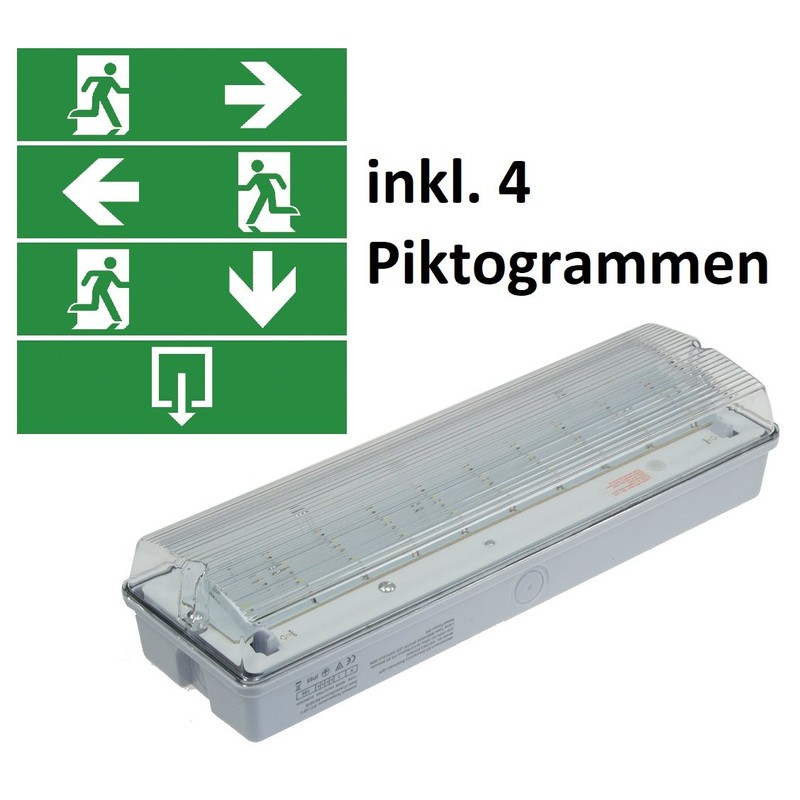 - Emergency light with directional arrows, escape route light for indoor and outdoor use, protection class IP65.
