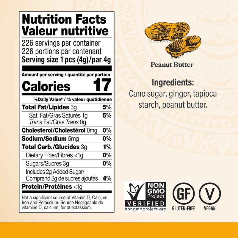 - SIMPLE INGREDIENTS: Cane Sugar, Ginger, Tapioca Starch, Peanut Butter.