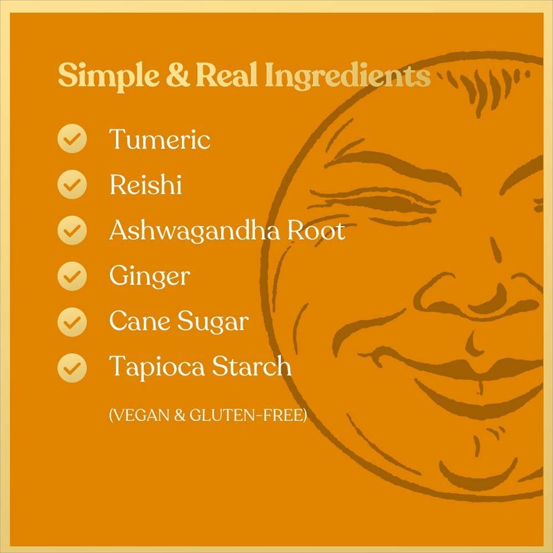 - DELICIOUS & HEALTHY — We marry rich flavors and healthful recipes in these adaptogen chews. They're cooked with Ayurvedic wisdom, utilizing ashwagandha, reishi and turmeric, supporting our bodies' innate ability to adapt to life's stresses. Tranquil turmeric tingles the tongue with it's mood taming zest to the rhythm of curcumin in the night!