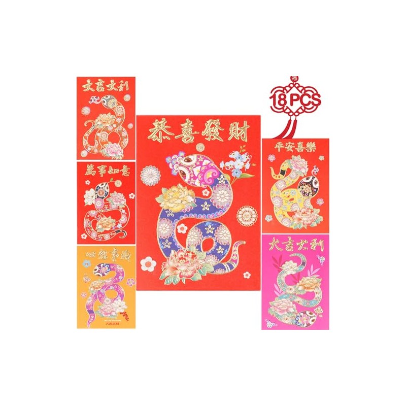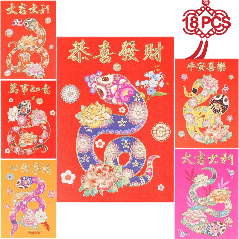 - 🧧Chinese Red Envelopes: 18pcs Chinese New Year Snake red envelopes in 6 patterns, design with Chinese classic elements. Each medium red envelope measures 4.52 x 3.15 inches (11.5x8cm).