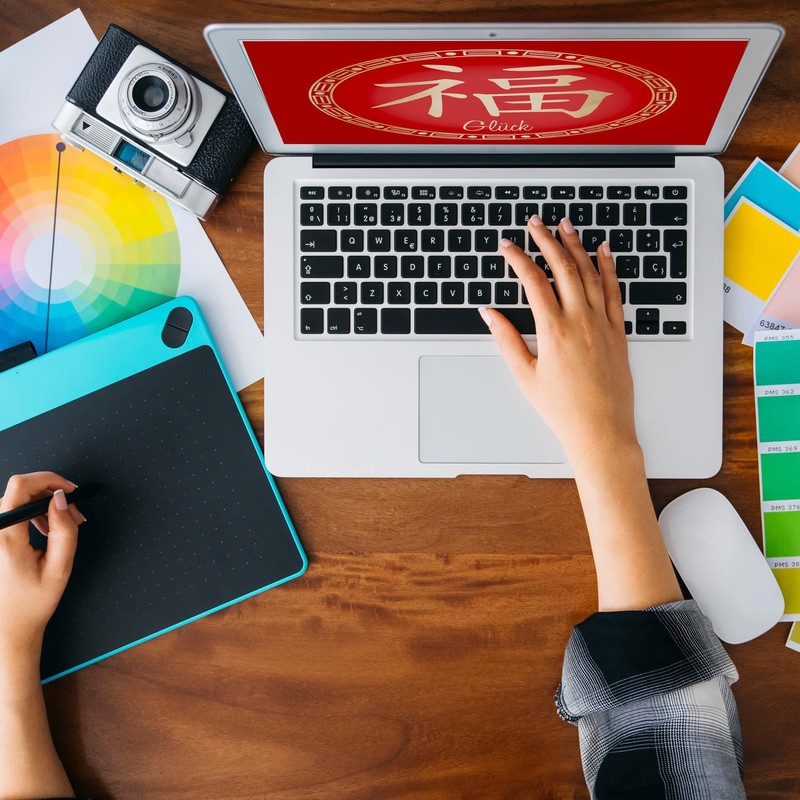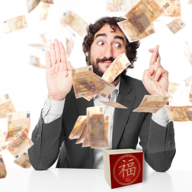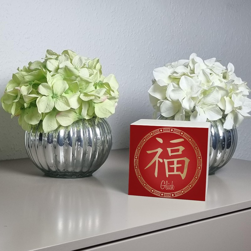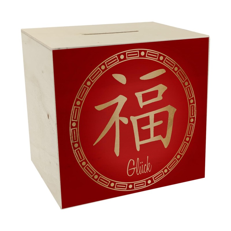 - On the money box is depicted in gold lettering the Chinese sign for good luck. Under the sign is the German translation. The background is red.
