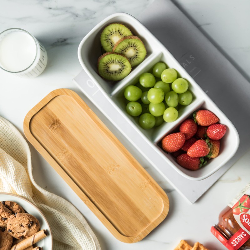 Set includes 1 natural tray and 3 porcelain dipping bowls