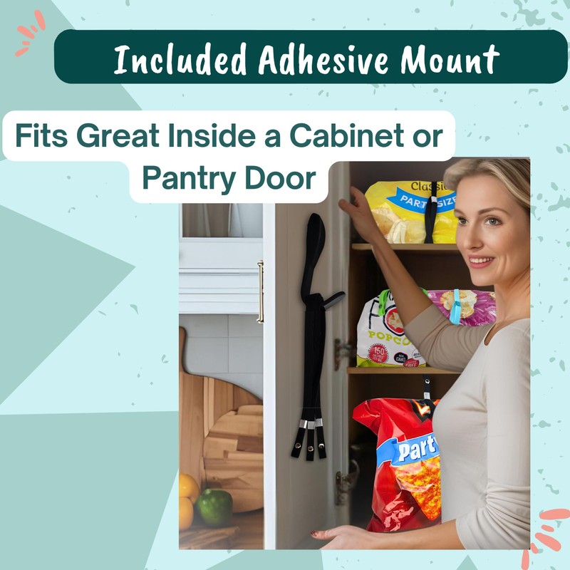 CHIP BANDS: Premium Adjustable Bands to Keep Snack and Food Bags Closed Fresh 5 Count With Adhesive Wall Hook to Keep Set Together* Bag Bands Chip Clips Electroplated LUXES (Black)